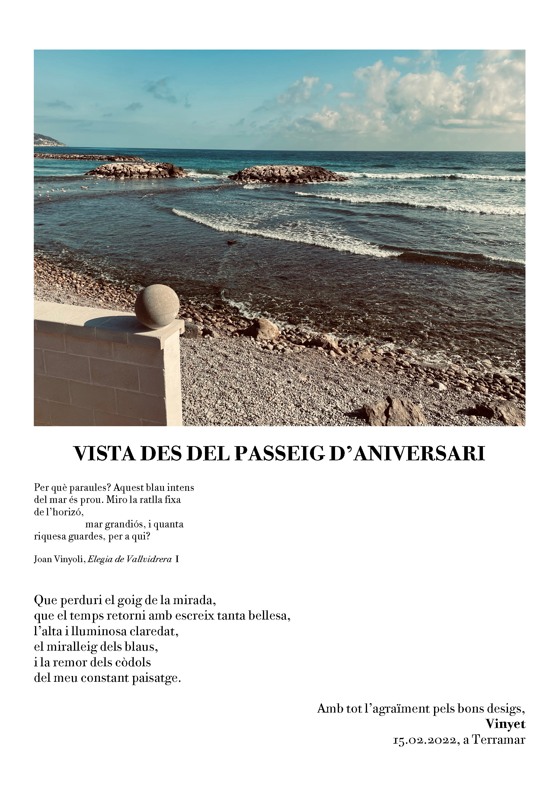 El primer dels poemes que dóna títol al llibre constitueix una declaració de principis enfront del repte de la quarantena – “Fa temps que ens cal romandre rere els vidres…” – amb l’esperança que “deixar de fer pot dur la llibertat”. El poeta passa revista del record del paisatge conegut – “El mar, de lluny, és un record antic…” -, del somni “davant d’un mapa / per creure que podem tornar a volar”. Els poemes deixen constància de la vida quotidiana en temps de pandèmia, els nous costums a través de nous mitjans com “l’espai lliure / – rectangular- / d’una pantalla”; de la vida amb mascareta, comptant com passen els dies tots iguals, de la vivència d’una diada de Sant Jordi amb el drac que “ens ha deixat sense festa”, de l’enyor de les ciutats, de la intensitat de les mirades als ulls que cerquen sortides. La visió crítica del poeta deixa constància també d’ “unes medalles / i la xerrameca/ que omplen les pantalles”, les “absurdes ordres/ rere un mur de condecoracions”. I no hi manca la visió de la Vila a través de la Festa, quan “als balcons endomassats / i, badant-se a les façanes / totes les flors de paper” donen vida a un nou i diferent “Corpus sitgetà”.